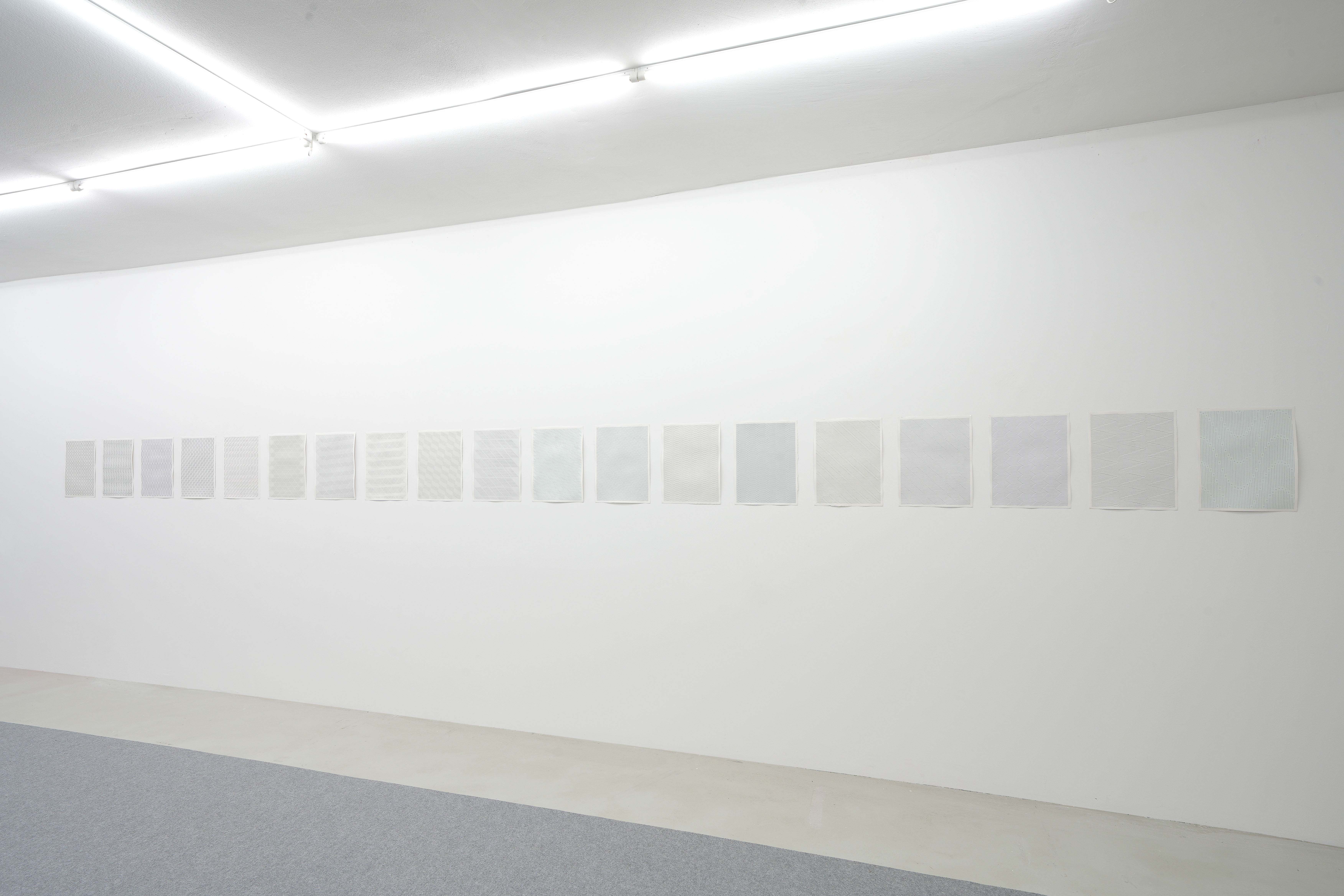 Auge erfasst und diese miteinander vergleicht, umso offensichtlicher werden die feinen Unterschiede der von Hand gezeichneten Linien. Einzelne Elemente beginnen zu vibrieren, zu flimmern und zu flirren und dennoch vermitteln die Bilder einen eher meditativen und stillen Eindruck.