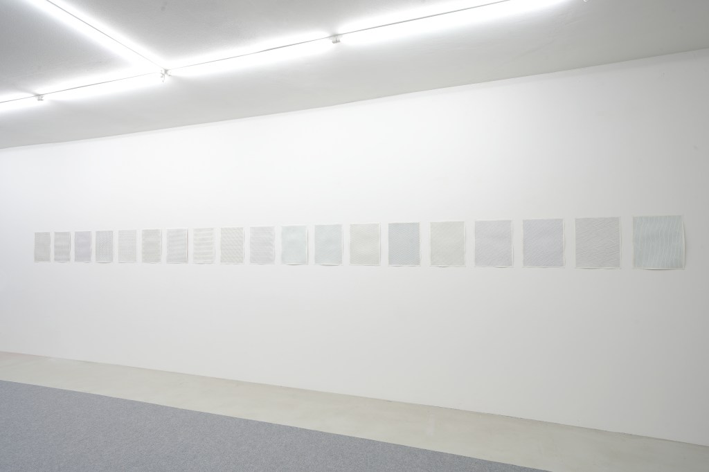 Meine Arbeiten bestehen aus zahlreichen Bleistiftlinien auf einer zartgetönten Fläche von Acrylfarbe. Bevor ich ein großes Bild male, übertrage ich meine Ideen zuerst auf eine kleine Leinwand oder ein kleines Papier. Außerdem kann eine Zeichnung auch als Grundlage für eine neue Skizze dienen: Es ist sowohl ein Ende als auch ein Anfang. Und dieser Prozess wird wiederholt. Einige dieser Skizzen werden auf Leinwand übertragen, die meisten