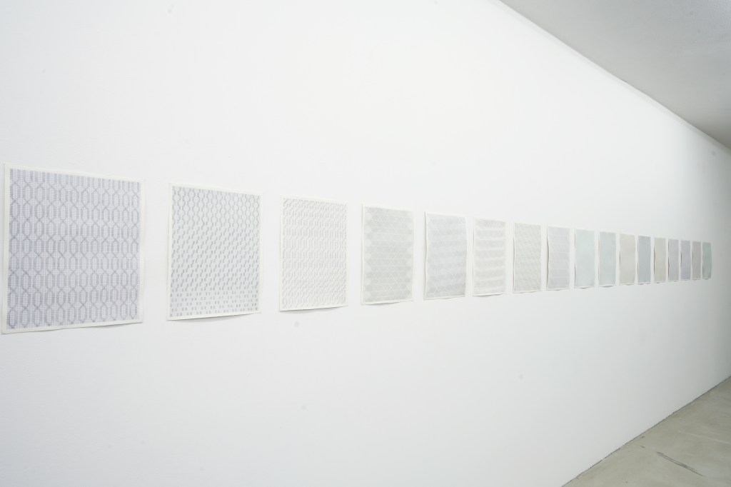Die Bilder erwecken den Eindruck eines Rasters oder Musters. Aus der Ferne erscheinen die Arbeiten flüchtig betrachtet wie monochrome Malerei. Wenn man jedoch näher kommt, werden symmetrische Muster erkennbar, von scheionbar makelloser Geometrie. Kommt man noch näher heran, treten zunehmend technische Details in den Vordergrund, einzelne Graphitstriche und Auslassungen werden sichtbar. Je mehr einzelne Striche das